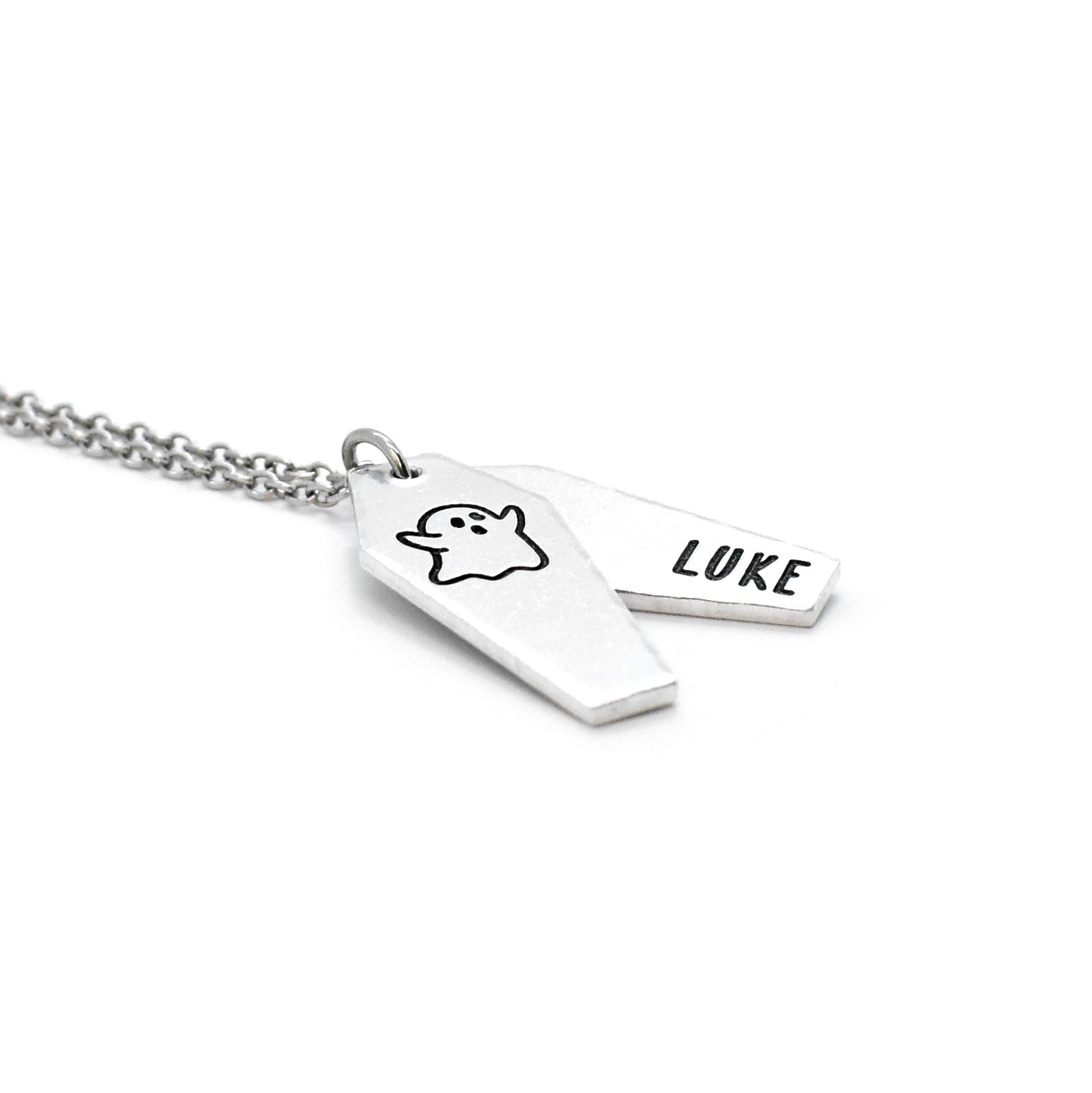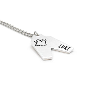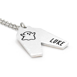 A creative layered ghostly, coffin style necklace, complete with personalisation for a special touch. The perfect gift for those into dark and alternative genres.