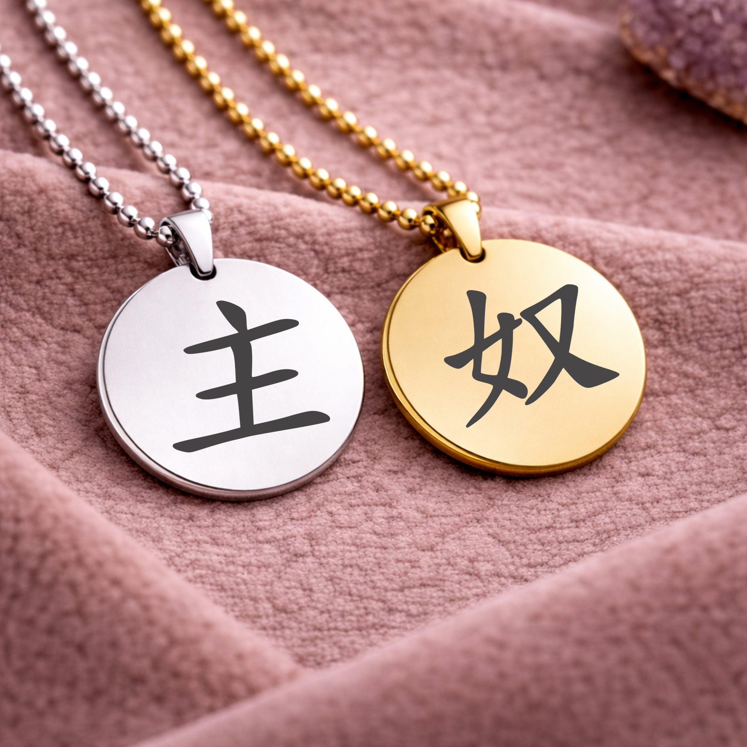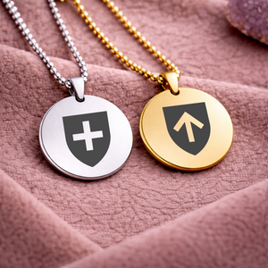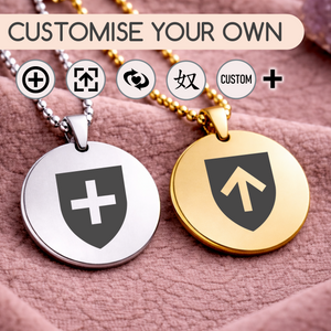 Each pendant is crafted with a smooth, polished finish and suspended from a classic ball chain, creating a timeless piece that can be worn openly or kept as a private marker. Choose from a curated selection of symbolic designs, meaningful characters, or upload your own custom symbol to create something that feels distinctly yours.