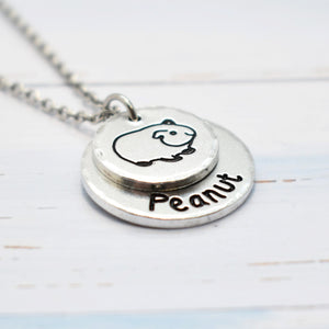 This handcrafted guinea pig necklace is individually hand-stamped and polished, creating a charming keepsake with a personal touch. Each pendant is made one letter and design at a time, then enamel-filled for a crisp, lasting finish. Add a name or word to make it uniquely yours — perfect for gifting or everyday wear.