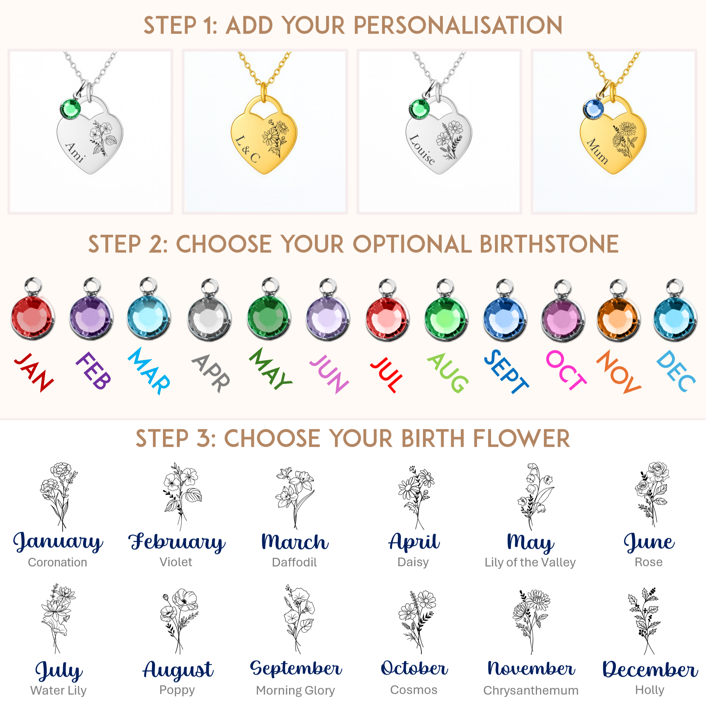 - Choice of 12 birth flowers and birthstones