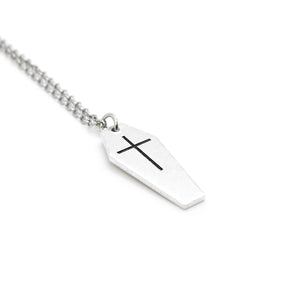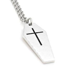 A creative crucifix, coffin style necklace. Optional personalisation also available to the back of the pendant too for an extra special touch.