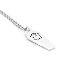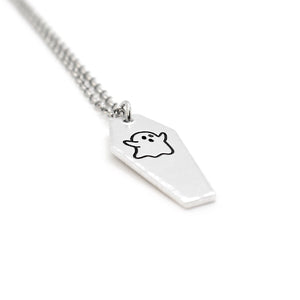 A creative ghostly, coffin style necklace. Optional personalisation also available to the back of the pendant too for an extra special touch.