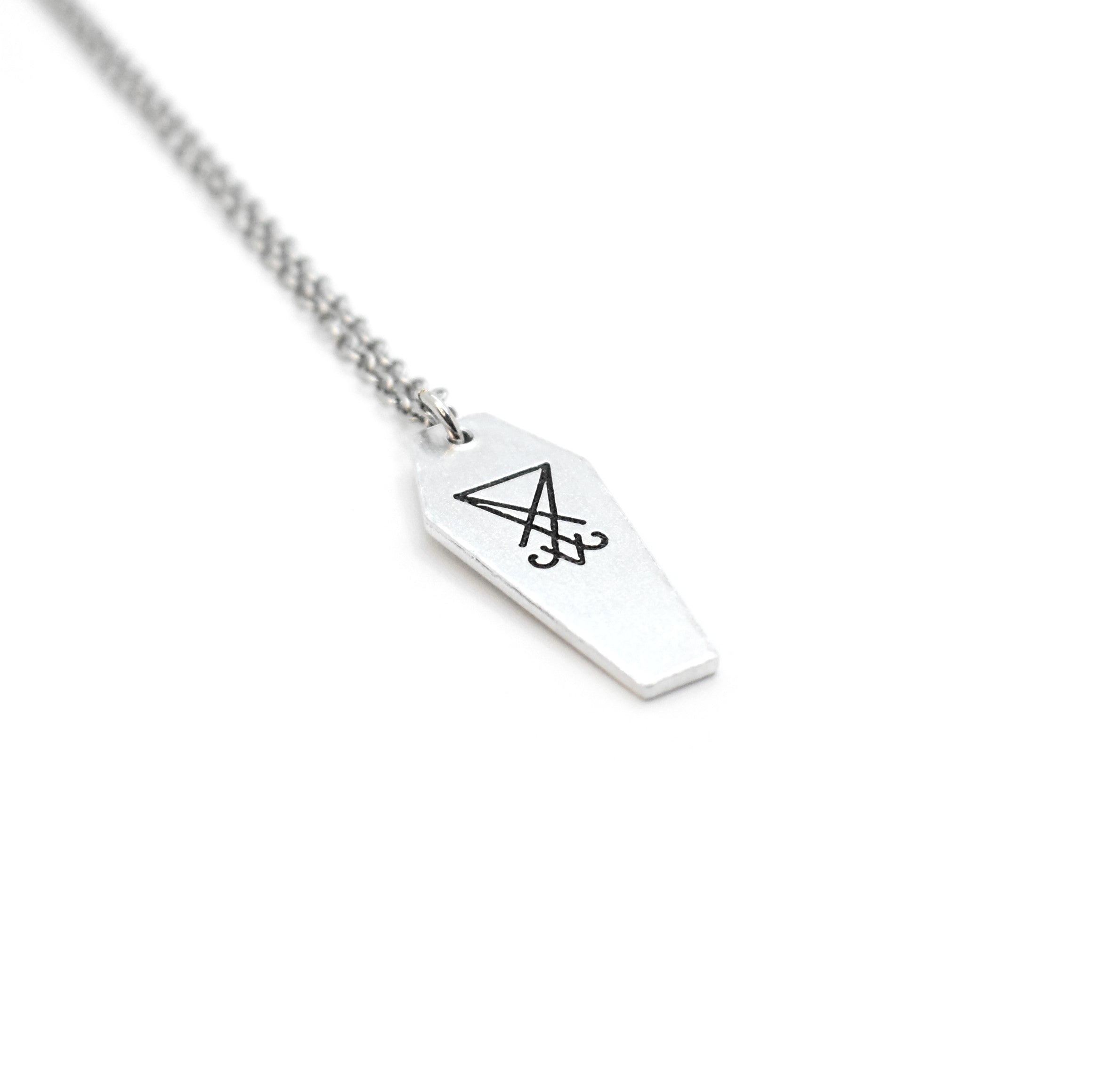A creative sigil of lucifer, coffin style necklace. Optional personalisation also available to the back of the pendant too for an extra special touch.