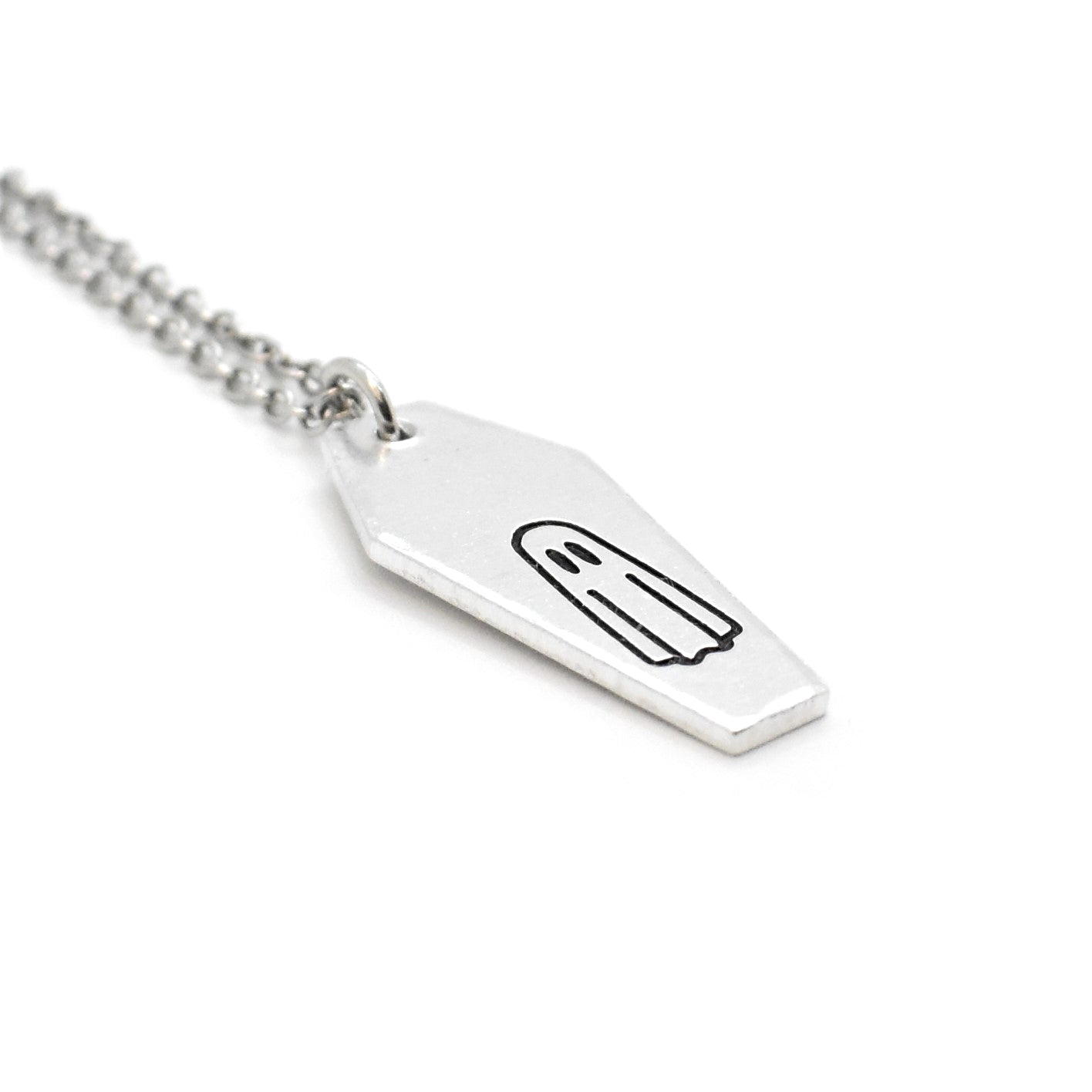 A creative ghostly spectre, coffin style necklace. Optional personalisation also available to the back of the pendant too for an extra special touch.