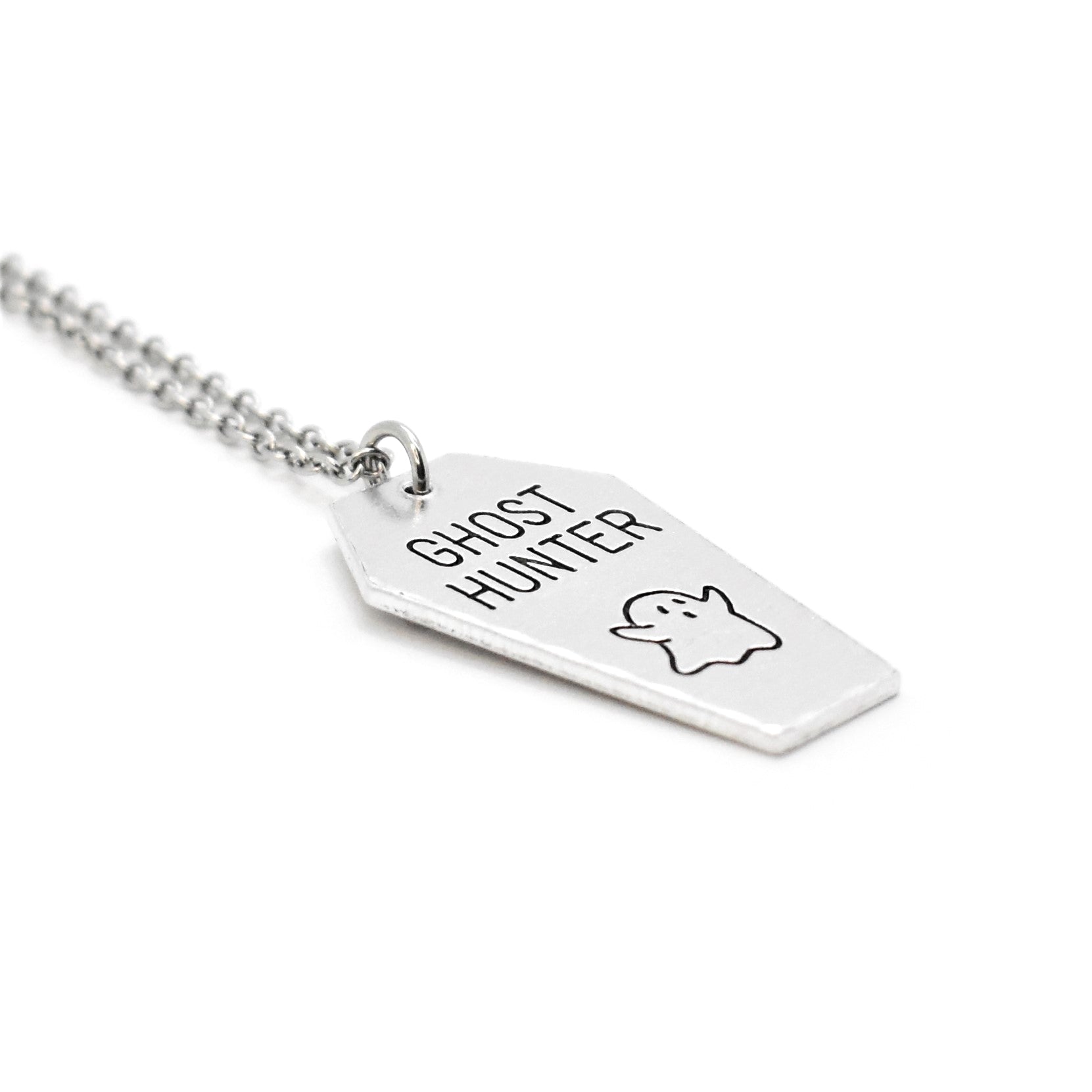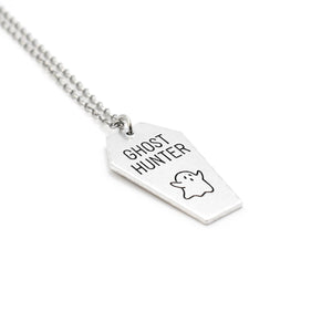 A creative coffin style ghost hunter necklace featuring a spooky spectre. Optional personalisation also available to the back of the pendant too for an extra special touch.