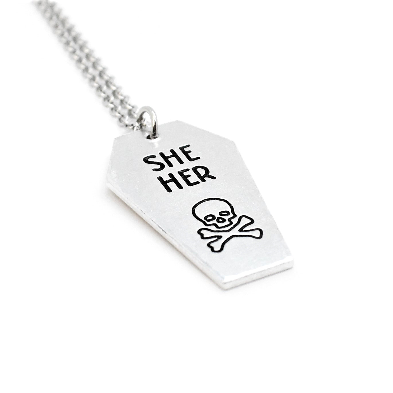 A creative pronoun coffin style necklace featuring the iconic skull and bones representing poison. Optional personalisation also available to the back of the pendant too for an extra special touch.