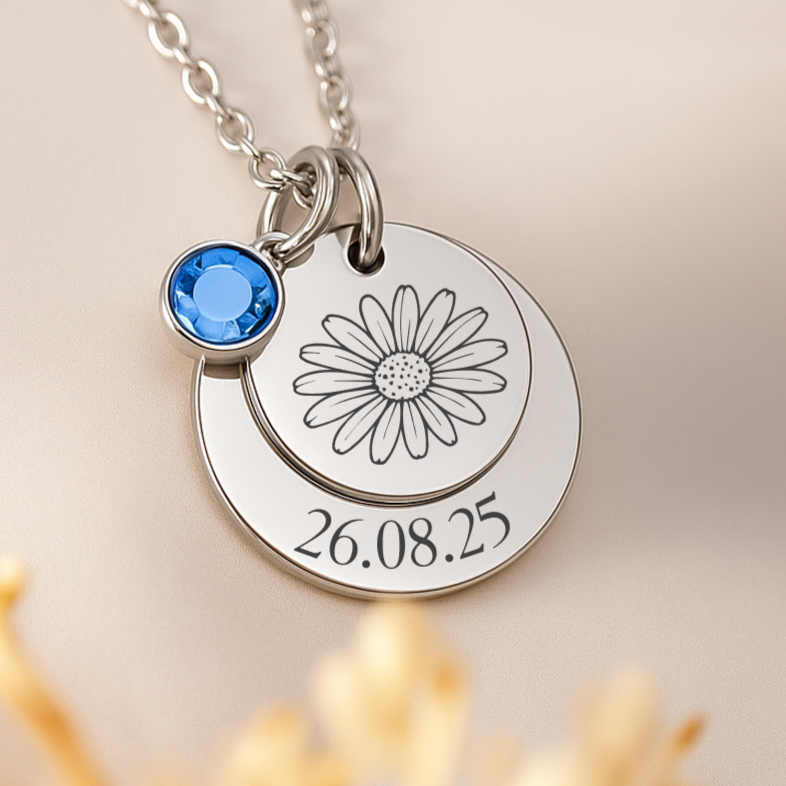 Resting beside the disc is a faceted gemstone charm, like a droplet of captured starlight. Choose a birthstone to honour your personality or your cosmic rhythm, mark a loved one’s birthday, or simply invite the hue that speaks to your soul. Each stone catches the light beautifully, adding sparkle and symbolism to your talisman.